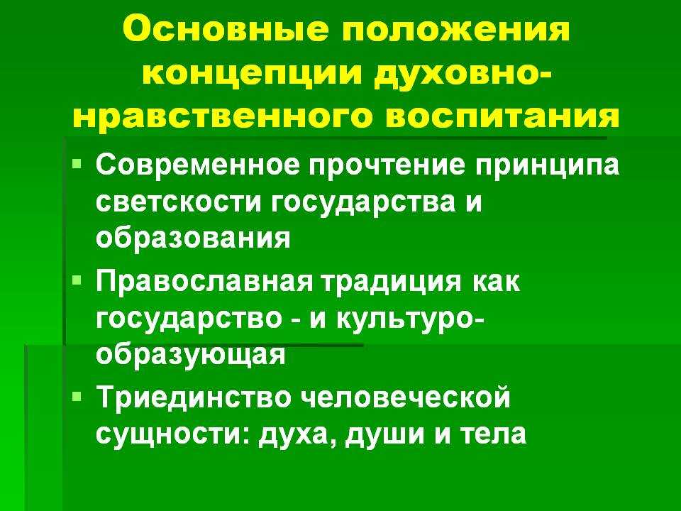 Главной целью озвученной концепции является определить принципы, пути развития и воспитания высоконравственной личности. Согласно ей, деятельность ДОУ и школы должна иметь своей целью формирование патриота, сознательного гражданина.