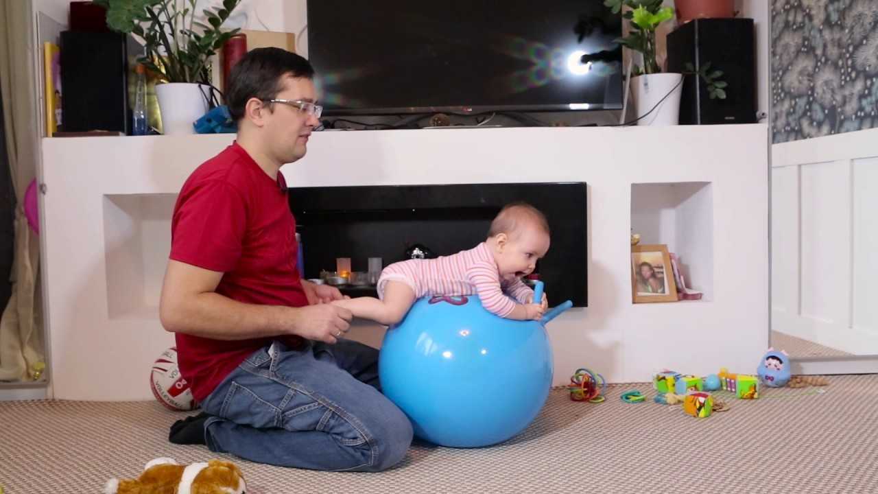 Занятия нужно проводить в игровой форме. Чтобы заинтересовать младенца, можно использовать гимнастический мячик – фитбол.