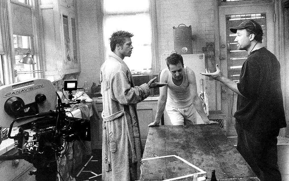 Дэвид Финчер, Брэд Питт и Эдвард Нортон на съемках фильма «Бойцовский клуб»