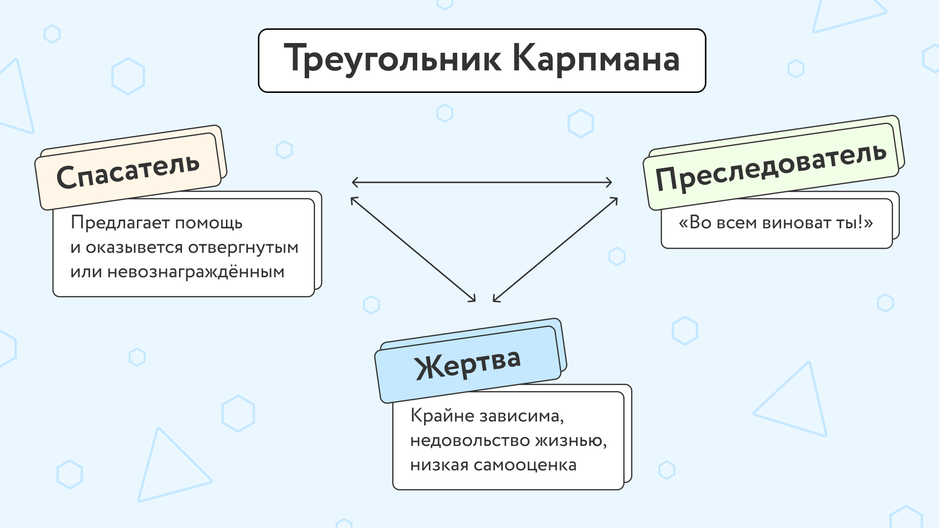 Постараться не бродить по треугольнику Карпмана: не быть ни Спасателем, ни Преследователем, ни Жертвой