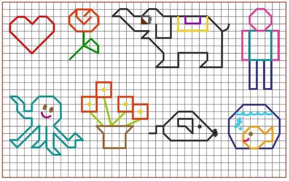 Принимают участие несколько детей. Взрослый раздает листы с крупными клеточками и ручку. Задание — рисовать линии без пробелов. Например, взрослый говорит: «Одна клеточка влево, одна клеточка вверх, одна клеточка вправо» и т. д. У малышей должен получиться крест. Дети сдают свои рисунки, взрослый оценивает работу похвалой.