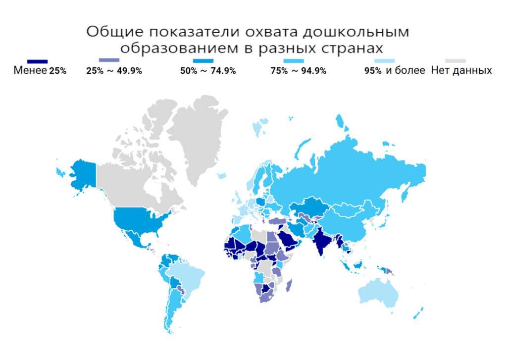 Несмотря на то что преимущества дошкольного образования очевидны, согласно статистике, более 175 млн детей по всему миру его не получают. Это примерно половина от общего количества детей дошкольного возраста на планете.