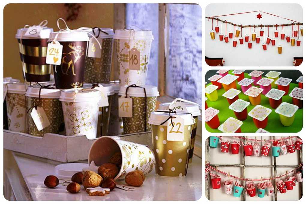 Календарь может состоять из пирамидок, кубиков, кульков, коробочек, сапожков, детских носочков и мешочков, одноразовых стаканчиков или стаканчиков из-под йогуртов, капсул от киндер-сюрпризов, праздничных бумажных пакетов или красиво оформленных конвертов.