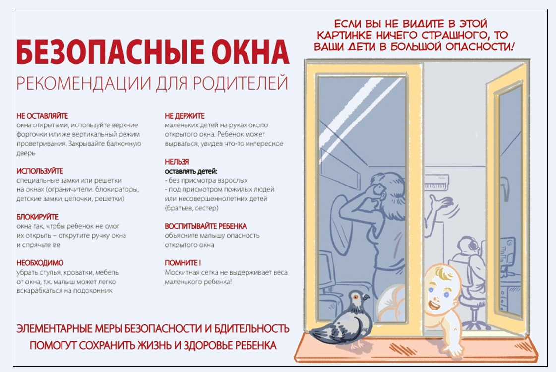 Ежегодно фиксируются несчастные случаи, связанные с выпадением детей из окон. Обычно это происходит, когда ребёнок залезает на подоконник и падает, прислонившись к москитной сетке.