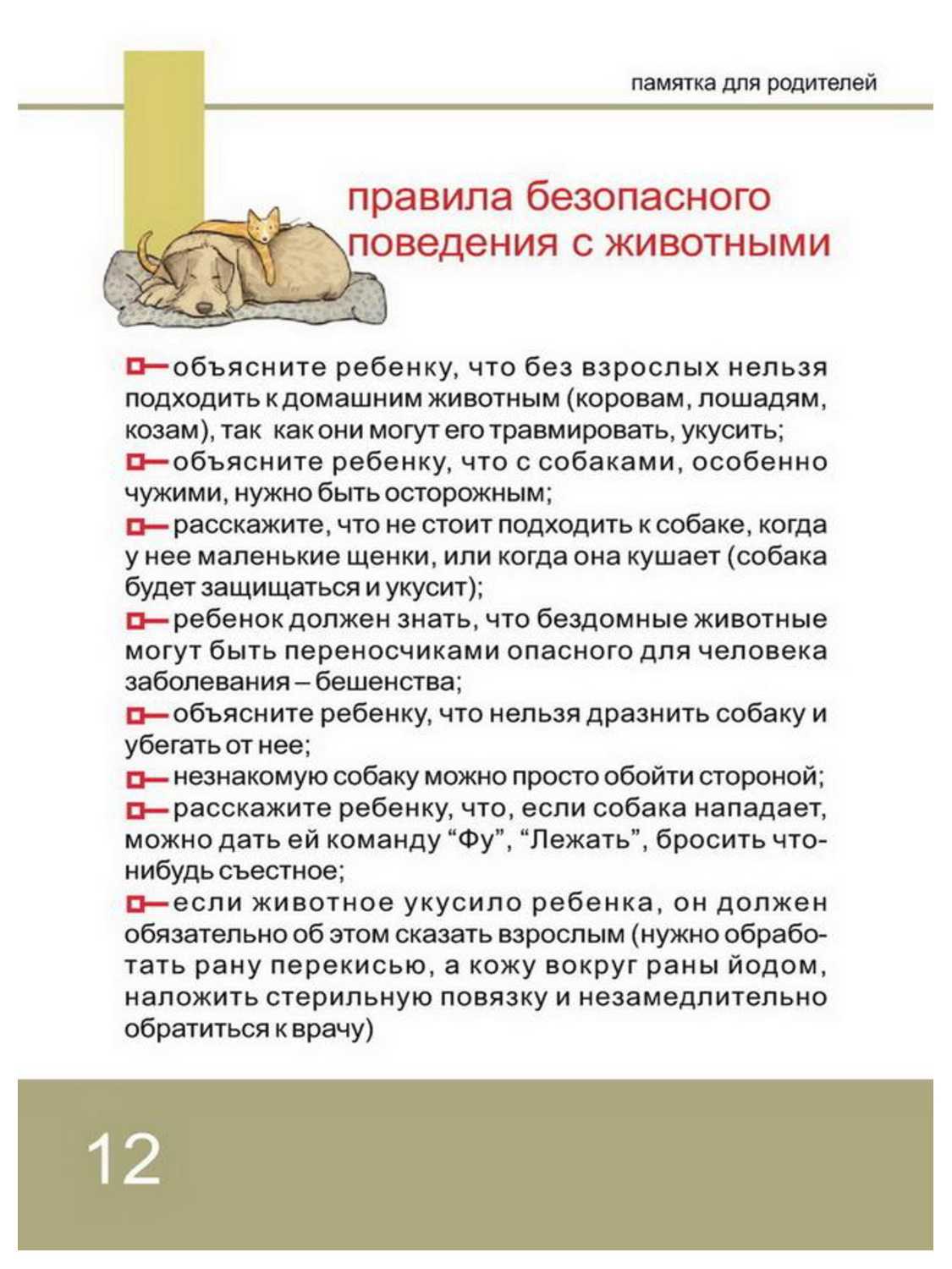 Детям нужно прививать не только любовь к животным, но и уважение к их способу жизни. Необходимо объяснить детям, что можно делать и чего нельзя допускать при контактах с животными. Например, можно кормить бездомных собак и кошек, но нельзя их трогать и брать на руки. Нельзя подходить к незнакомым собакам, беспокоить их во время сна, еды, ухода за щенками, отбирать то, во что играют собаки. Напоминайте детям, что и от кошек, и от собак передаются людям болезни – лишаи, чесотка, бешенство. После того, как погладил животное, обязательно нужно вымыть руки с мылом.