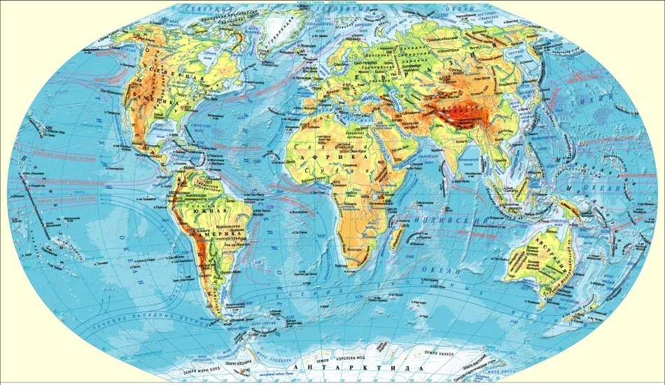 океанами. На географической карте мира показаны равнины, горы и реки, материки и