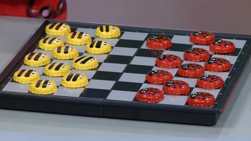 Стимулом для фантазии послужит место для надписи или наклейки на поверхности каждой шашки. Вписываем цифры и определяем победителя по заработанным очкам;, даже оставшись без единой фигуры, можно стать победителем, если набрать много «дорогих» трофеев. Чтобы увлечь шашками малышей, приклеиваем к каждой изображения кузнечиков, кроликов или кенгуру. В «кузнечиковую чехарду», играем по обычным правилам: животное побеждает, перепрыгивая через противника.