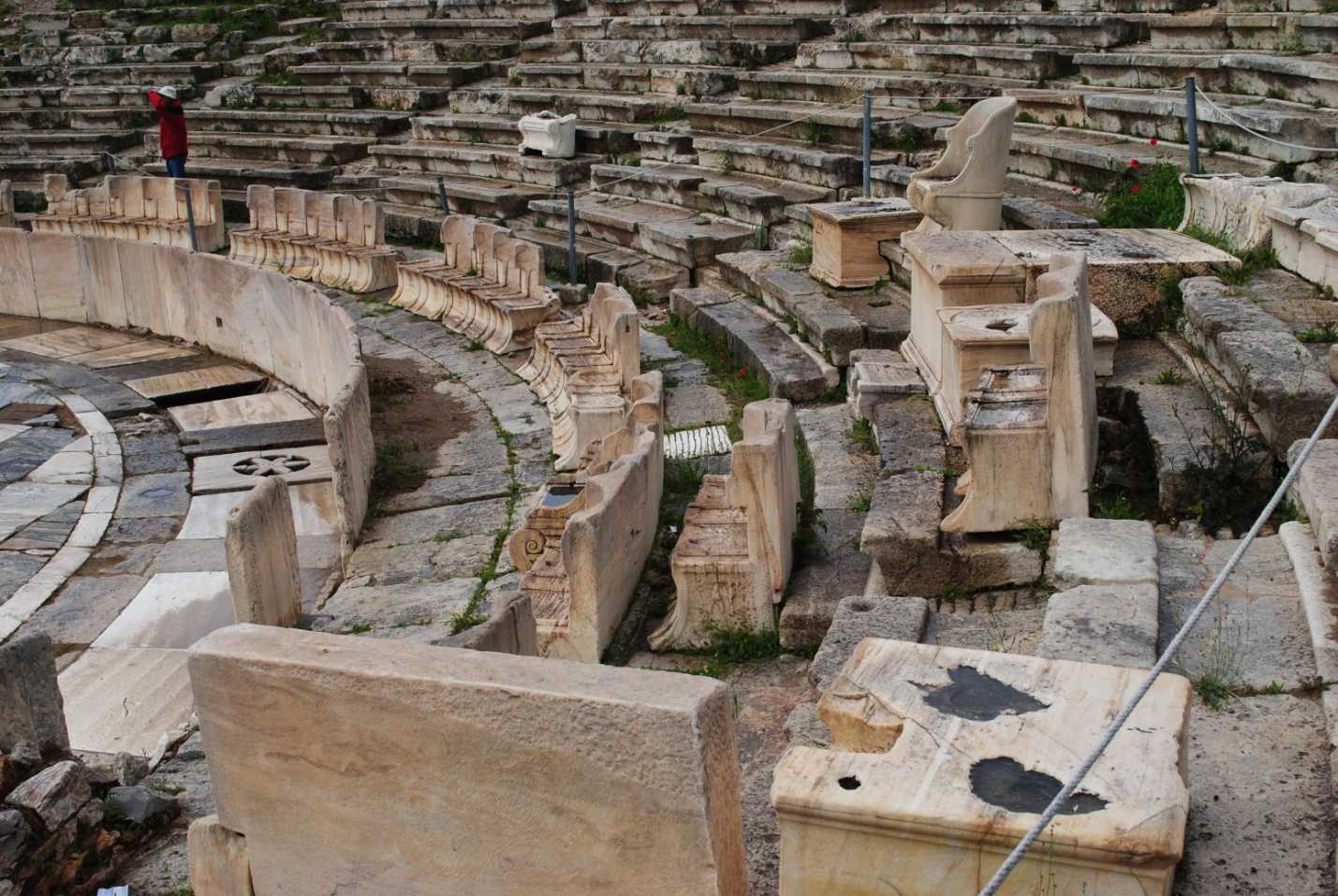 Сначала люди просто сидели на склонах холма. Позднее для них были построены сиденья: деревянные, потом каменные. Они располагались полукругом вокруг орхестры. Внизу находились места для знати, почетных граждан и жрецов. Они могли быть с каменными спинками и балдахинами для удобства. Выше находились места для “среднего класса” и наверху для бедноты. Продольные проходы (пароды) делили места на сектора и на верхние и нижние места.