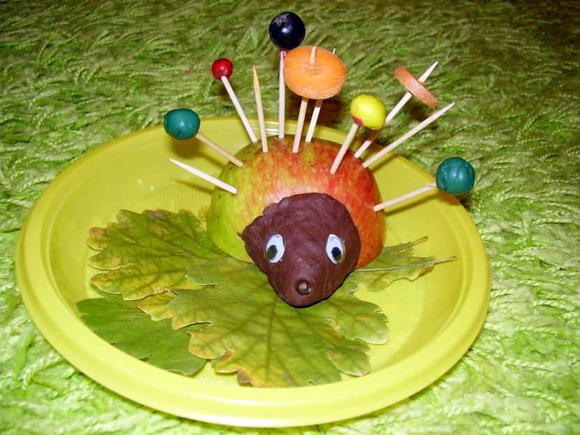 Существует несколько вариантов того, как работать над поделкой такого типа. Основа всегда будет одинаковой – это половина яблока. Именно так будет выглядеть тело ежика. Нос ему можно слепить из пластилина, а после добавить глаза. Далее необходимо поработать над колючками. Они могут быть сделаны из зубочисток либо кусочков самого яблока. В первом случае деревянные палочки просто ломают пополам и втыкают в спину ежа. Дополнительно можно нанизывать на них виноградины, чтобы колючки смотрелись более эффектно.