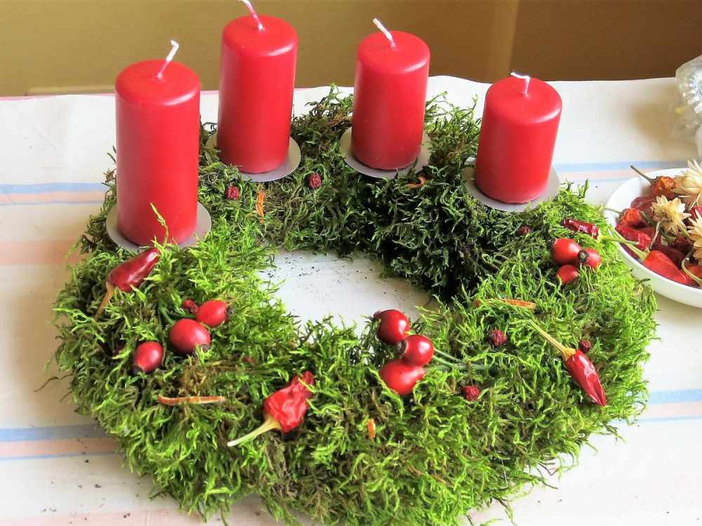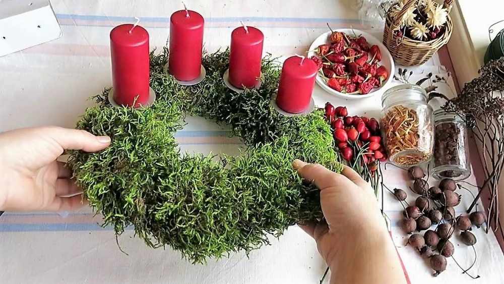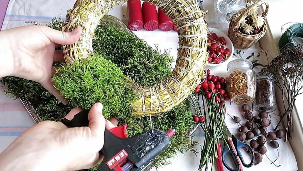 Следующим этапом является декорирование основы. Для этого следует использовать горячий клей, а также нить, подходящую под цвет основы. Мох крепится неравномерно, особенно плотно следует оклеить периметр основы и оставить места для будущего крепления яиц.