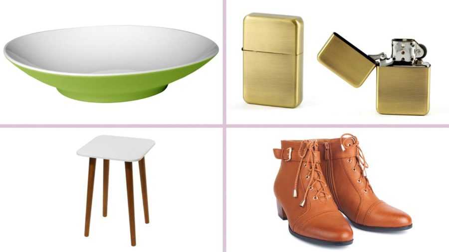 - тарелка, зажигалка, табурет, ботинки;