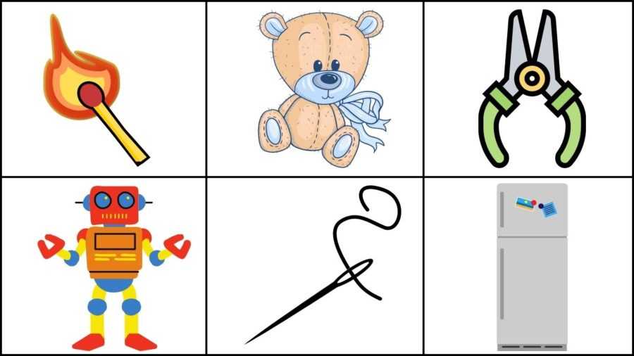 Педагог раздает игрокам изображения разных игрушек и бытовых предметов: книги, мяча, зажигалки, велосипеда, утюга и прочих. Затем называет изображенные объекты по очереди, спрашивает, можно ли с ними играть. Игрок, у которого есть названое изображение, развернуто отвечает на вопрос, то есть объясняет, почему с этим предметом играть нельзя.