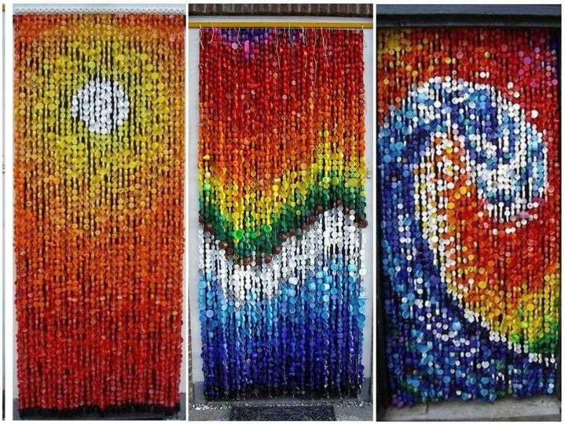 Оригинальные и яркие шторы для дачи – еще один вариант использования пробок от пластиковых бутылок. Согласитесь, большое количество материала лучше приобрести на оптовой базе или заказать через Интернет.
