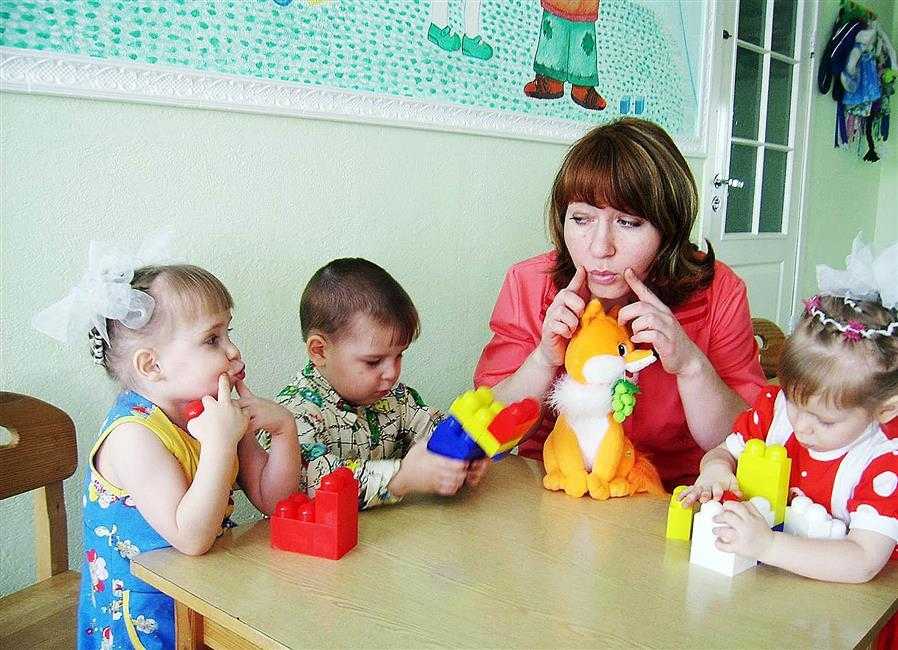 Занятие дефектолога. Многие родители не знают о существовании такого педагога в детском саду. Работа этого специалиста в ДОУ начинается с диагностики социального, речевого и познавательного развития ребёнка, определения его способности к обучению. Если у дошкольника есть определённые нарушения, составляется план работы по их коррекции. Как правило, коррекционная работа ведётся по небольшим подгруппам (4–6 человек) и индивидуально. В подгруппах можно развивать у детей с психическими нарушениями способности к командной игре и социальному взаимодействию в целом. Индивидуально педагог может заниматься с ребёнком коррекцией устойчивости внимания, усидчивости, развитием координации рук, преодолением заикания. По последнему на занятиях практикуются дыхательные, голосовые, расслабляющие упражнения, а также задания на координацию произношения слов с движениями рук (например, короткие стишки с хлопками).