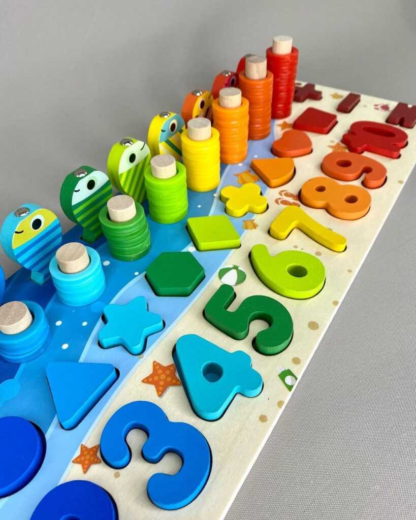 С маленькими детками достаточно просто учиться точно попадать магнитным концом удочки по фигуркам. Но по мере роста и развития крохи можно придумать массу усложняющих моментов, позволяющих изучать понятия цвета, счета, размеров, сравнения, количества, обобщения. Вот несколько примеров: