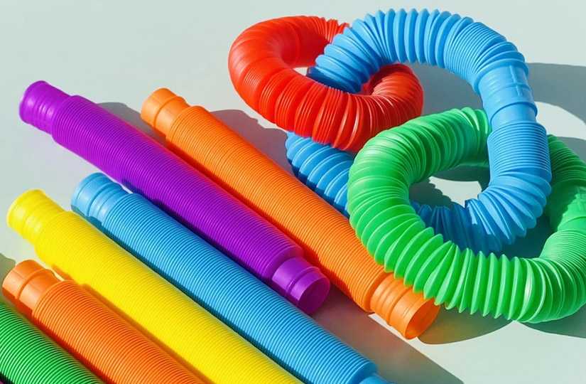 - Поп-туб (Pop tube) – пластмассовая трубочка, сделанная по принципу гофрированной трубы, которую можно растягивать и снова сжимать. Трубочки стыкуются между собой и могут превращаться в один большой «водопровод».