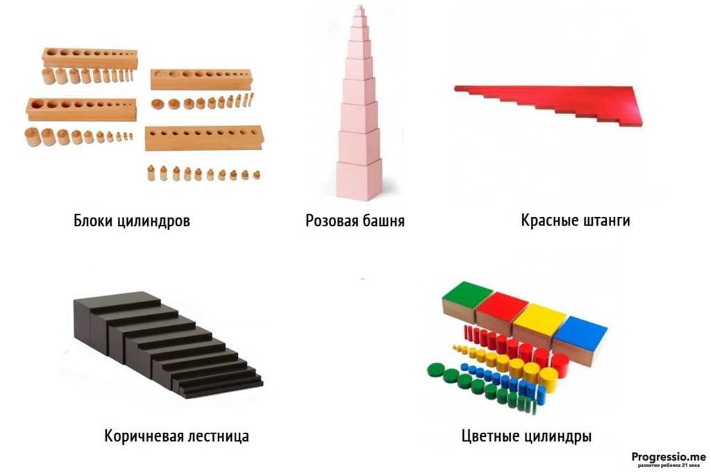 Наряду с обычными предметами методика предполагает использование специальных пособий, разработанных Марией Монтессори
