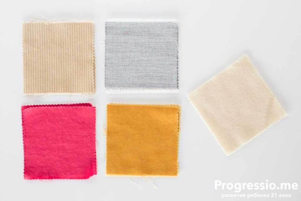 Для развития тактильного чувства — шершавые таблички и различные ткани.