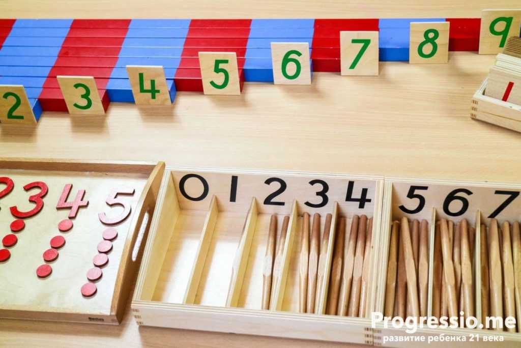 Для счёта в пределах 10 — числовые штанги, таблички с цифрами (шероховатые и тактильные), веретена.
