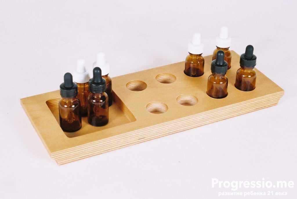 Для развития вкуса — «вкусовые бутылочки», набор бутылочек с пипетками, каждая со своим вкусом (горький, сладкий, кислый, соленый). Ребенок поочередно пробует каждый вкус.