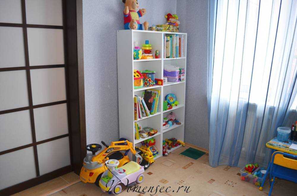 На нижних полках шкафа книги по возрасту Максима, на верхних — на вырост и мои. Нижние полочки — это гараж, машины мы очень любим. Также есть полочка с логическими игрушками, музыкальными инструментами и полка с животными, продуктами и кассой (здесь масса ролевых игр «магазин», «покорми зверей», «кто что ест», «чаепитие» и т. д.).