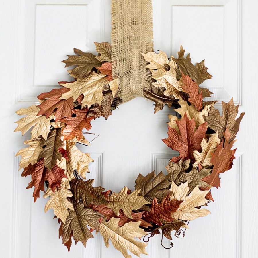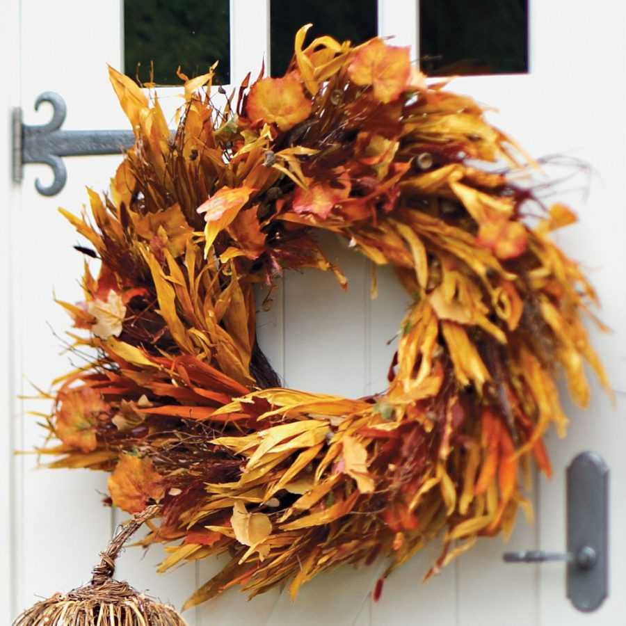 Пользуясь описанными выше сочетаниями цветов, можно сделать венок из листьев. Возьмите несколько гибких прутьев и скрепите их в виде венка.