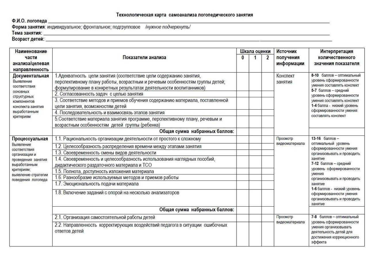 Важно! Самооценка является условием творческой работы преподавателя-логопеда. В проведении самоанализа поможет технологическая карта самоанализа логопедического занятия