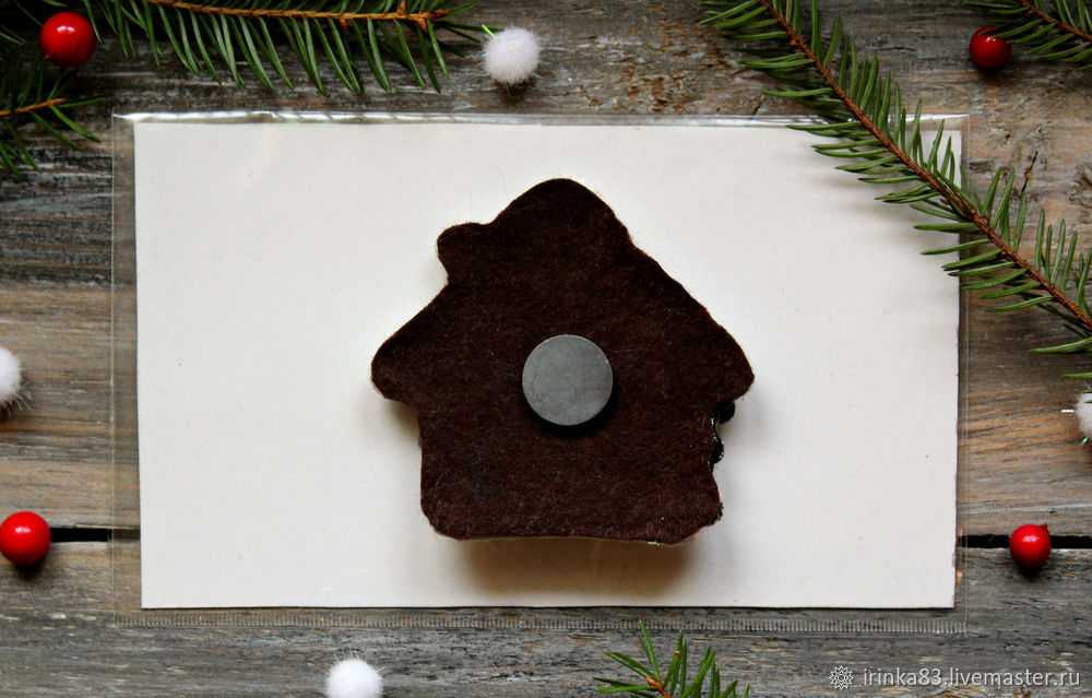 Приклеиваем к каждой избушке заготовку из фетра, а поверх нее магнитик.