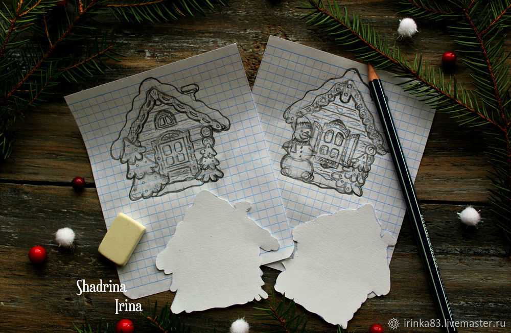 Для начала рисуем или печатаем на принтере избушки. Вырезаем трафарет из плотной бумаги.