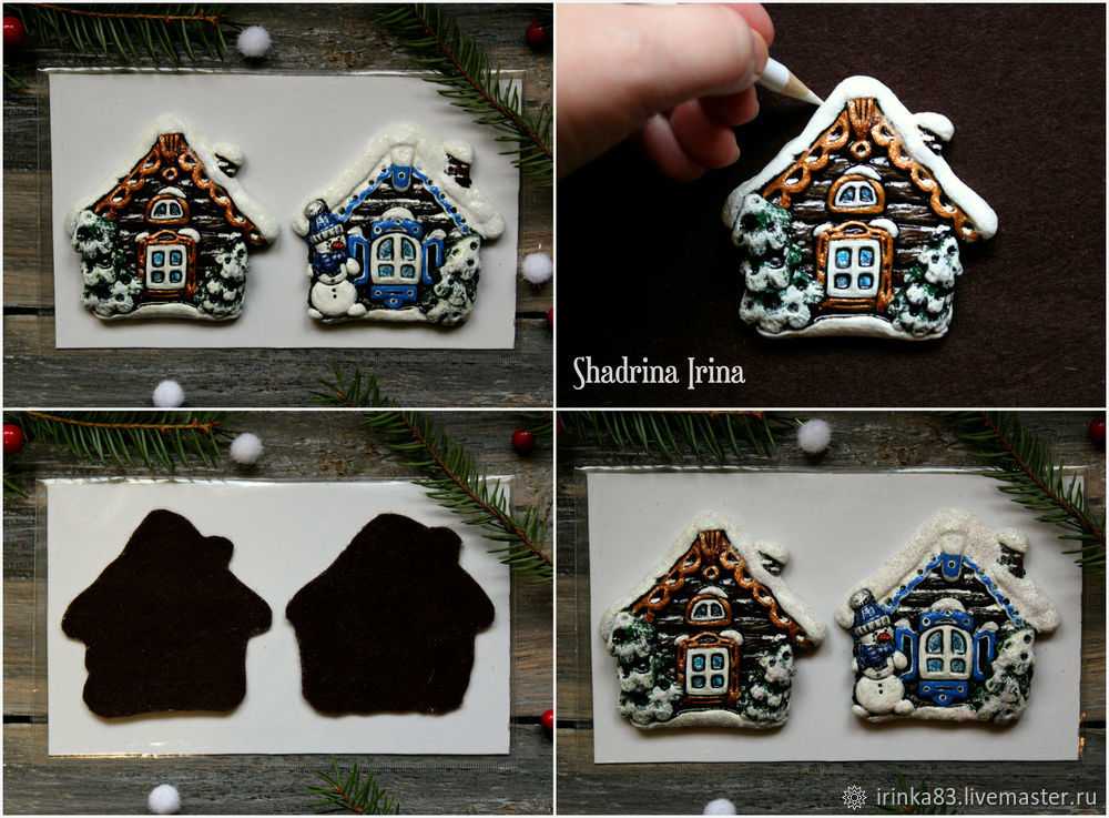 Покрываем фигурки прозрачным лаком. Из фетра вырезаем обратную сторону избушки. Там, где нарисовали снег, наносим тонкий слой клея и посыпаем глиттером. После его высыхания можно добавить еще несколько страз.