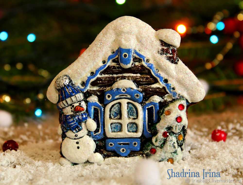 Повторяем то же самое снизу окошка. Также делаем ставни из теста. Формируем три шарика разного размера для снеговика. Сплющиваем их и прикрепляем к домику, как показано на фото. Не забываем сделать шапку, шарфик, а также нос, руки и ноги.