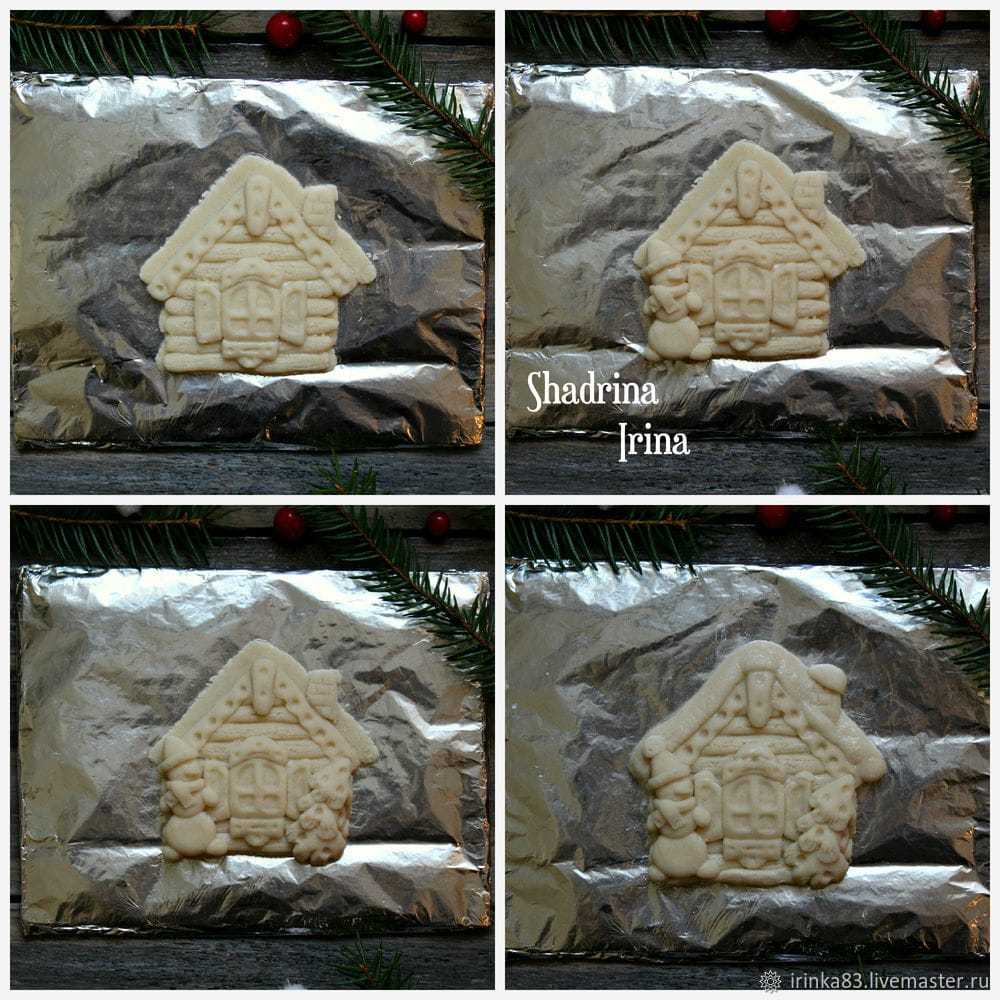 На другой стороне делаем елку немного меньшего размера. В каждой из них делаем углубления, а также снег на окнах и крыше.