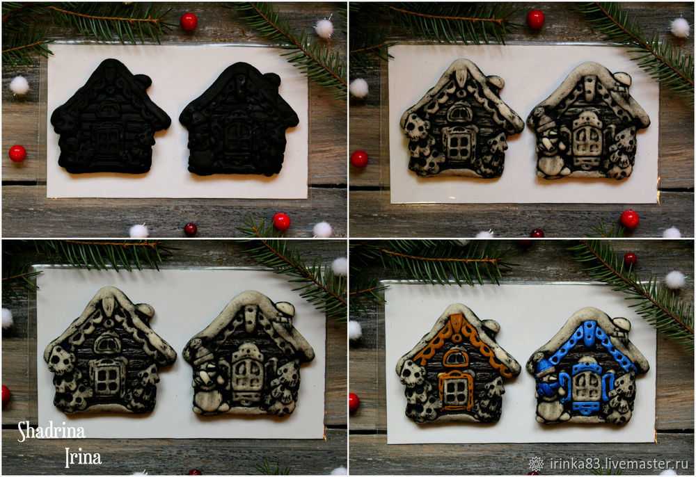 Оставляем заготовки до полного высыхания. Покрываем их гуашью черного или коричневого цвета. Когда она полностью высохнет, смываем ее, чтобы фигурки получились рельефными. Аккуратно расписываем избушки акриловыми красками.