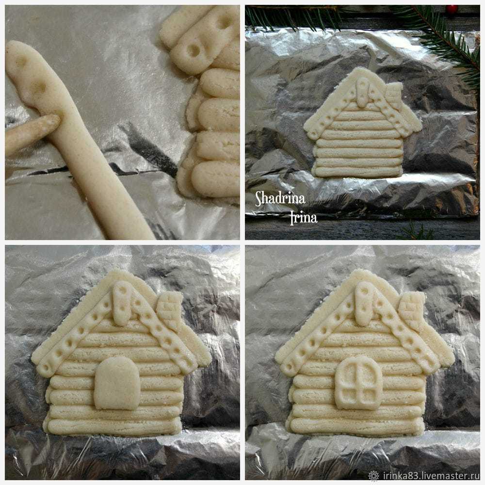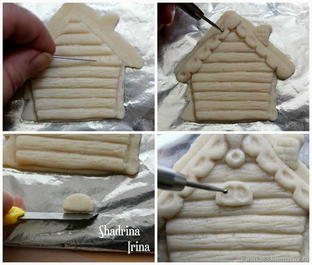 С помощью иголки или зубочистки аккуратно проводим линии на бревнышках, чтобы они выглядели более натурально. Из остатков теста формируем еще две полоски. Смазываем водой и переносим на крышу избушки. С помощью дотса или зубочистки делаем небольшие углубления, как показано на фото. Делаем небольшой шарик, сплющиваем и разрезаем на две части. Прикрепляем к домику и делаем углубления.