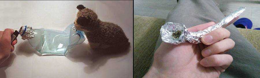 Курение и вдыхание: скрученные или мелко нарезанные листы бумаги, фольга, мутные стеклянные трубки и колбы, пожелтевшие пластиковые бутылки с прожженными дырами, бумага, зеркальца и лезвия со следами травы или порошка.