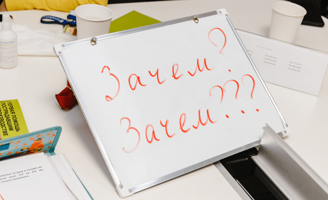 Главный вопрос, который нужно задавать себе на протяжении всего процесса оказания первой помощи — «зачем»? Зачем транспортировать человека, зачем совершать активные действия, зачем использовать то или иное средство из аптечки и так далее. Этот вопрос написан на доске и каждый раз, когда участники будут делать что-то без очевидной мотивации, преподаватель будет обращаться к нему.