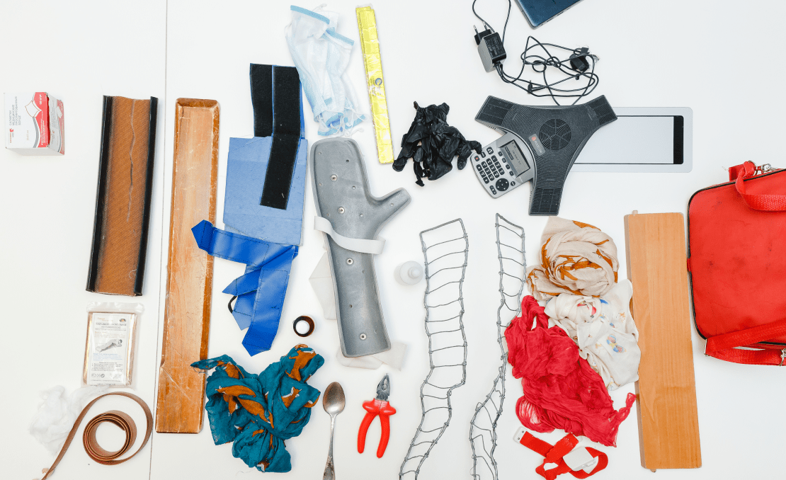 Перед началом практического занятия Нина выкладывает на стол различные предметы для оказания первой помощи — от медицинского жгута и спиртовых салфеток до женских шарфов и деревянных досок. Здесь предметы, которые должны быть в аптечке, в сочетании с подручными средствами.