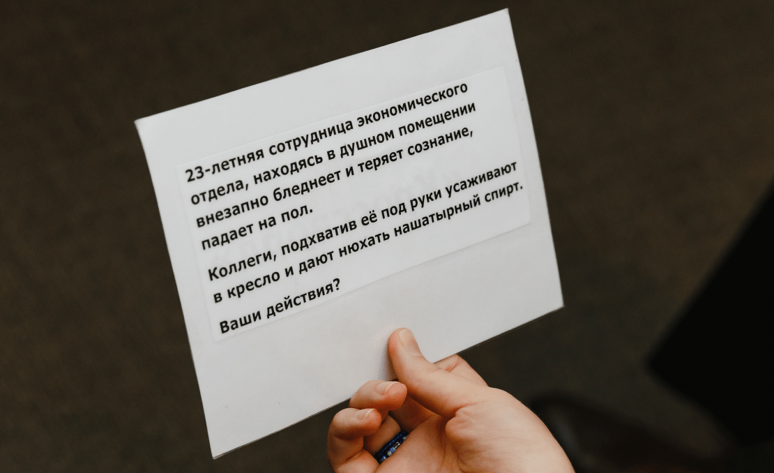 Все присутствующие на обучении разбиваются на команды по 3-4 человека. Каждой команде выдаётся карточка с описанием ситуации, в которой необходимо оказание первой помощи. За условие берётся, что скорая помощь прибудет через 7 минут, и до этого времени необходимо помочь пострадавшему, не сделав ему хуже.