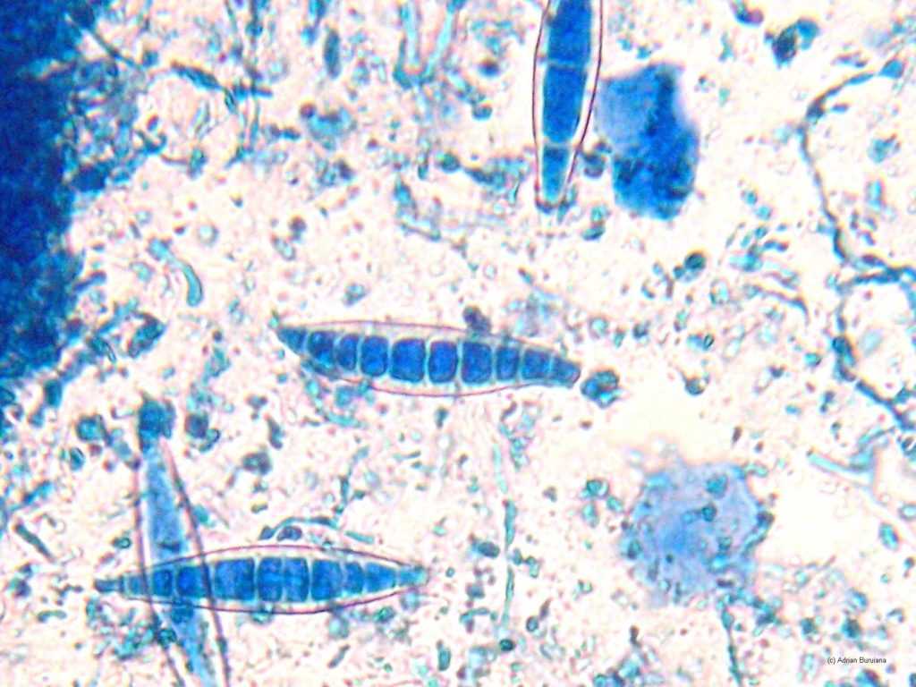 Собранный материал помешается под предметное стекло, капают 20% калия гидроксида, спустя 30 минут уже можно рассматривать результат под микроскопом. Можно заметить в чешуйках нити мицелия, а на поверхности волоска большое количество спор, которые, как мелкие шарику, прикреплены к нему по всему наружному периметру. Это становится причиной того, что волос не имеет четкой границы, она более размытая.