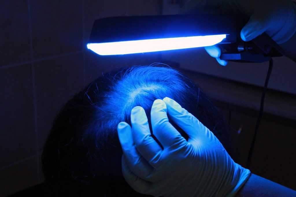 - Люминесцентное исследование. С помощью лампы Вуда можно быстро определить заболевание у ребенка. Пораженный волос при люминесцентном исследовании начинает светиться зеленым цветом. Обязательным условием диагностики является очищение очагов поражения от мазей и корок, проведение исследование в темной комнате.