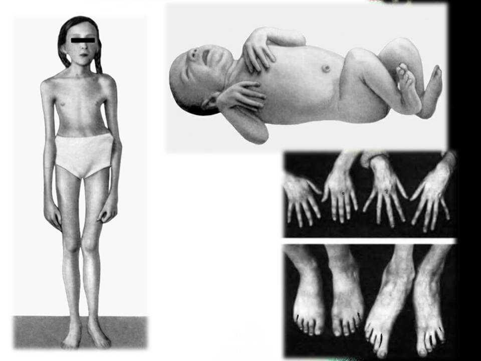 - Опорно-двигательный аппарат: телосложение астенической формы (дети худые), высокий рост у мужчин 190±10 см, у женщин 179±8 см, слаборазвитый подкожно-жировой слой, длинные пальцы (паукообразные), плоскостопие, череп и лицо вытянутые и узкие, недоразвитость скул, нарушение развития зубов и прикуса, вытянутая нижняя челюсть, готическое верхнее небо, (смотрите на картинки выше). С возрастом ребенка может прогрессировать деформация позвоночного столба, с развитием сколиоза. Также может деформироваться грудная клетка, образуется вдавление – «грудь сапожника». Деформированный тазобедренный сустав нередко приводит к инвалидности при неоказанном своевременном лечении.