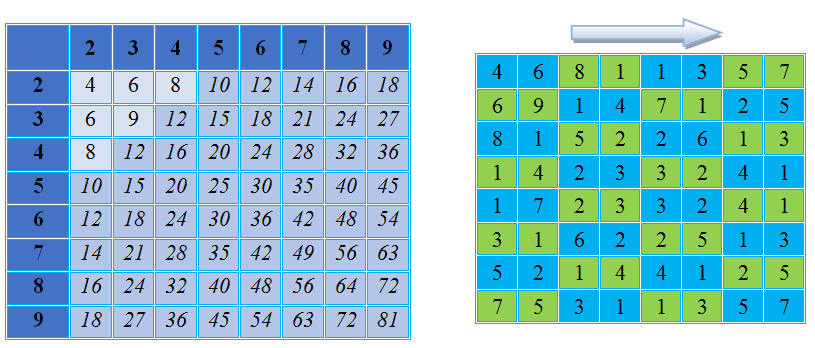 Еще одним, но не последним, необычным свойством таблицы можно назвать следующее. Если все двузначные числа привести к однозначным (как указывалось ранее) а затем поочередно вычитать соседние по горизонтали, а затем по вертикали – в итоге получится 0.