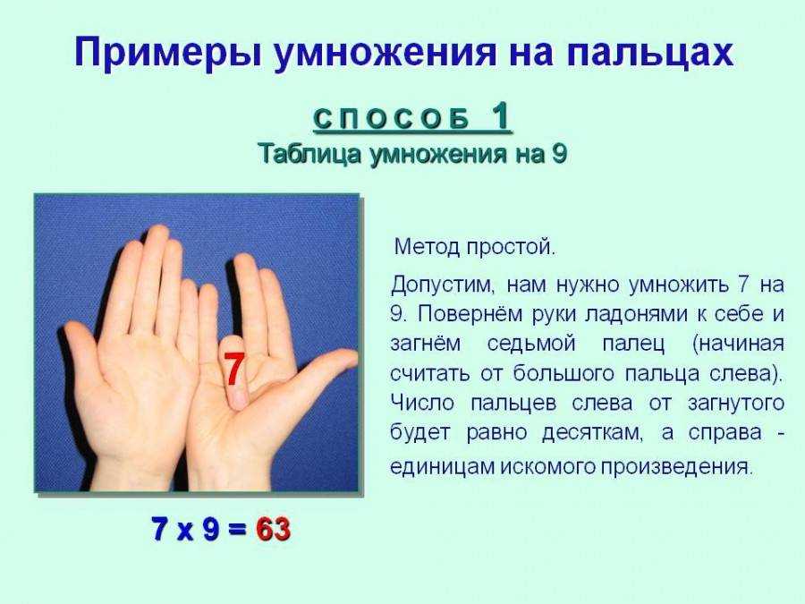 Для этого положите руки ладонями вверх, пальцы разогните. Мысленно пронумеруйте пальцы слева направо от 1 до 10. Загните тот палец, на какое число нужно умножить 9. Например, нужно 9х3. Загибаете 3 палец. Все пальцы слева (их 2 — это десятки), пальцы справа (их 7) — единицы. Соединяем десятки и единицы, получаем — 27.