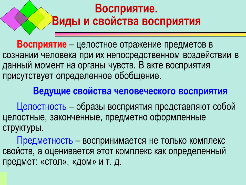 - ощущения складываются в комплексную «картинку», образуя восприятие.