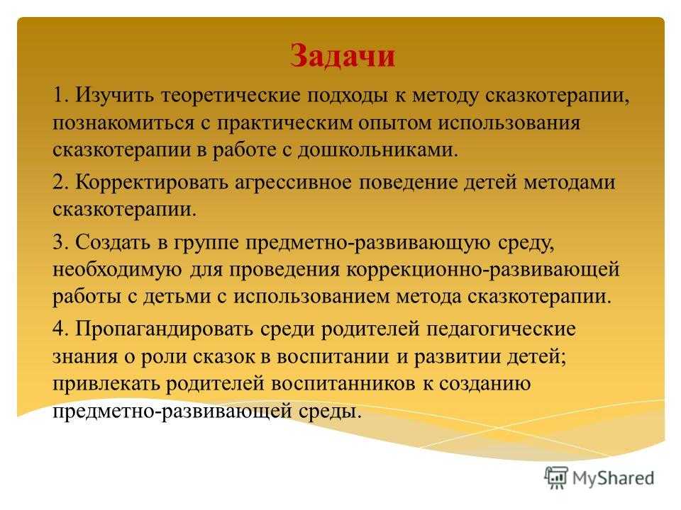 Задачи 1. Изучить теоретические подходы к методу сказкотерапии, познакомиться с практическим опытом использования сказкотерапии в работе с дошкольниками. 2. Корректировать агрессивное поведение детей методами сказкотерапии. 3. Создать в группе предметно-развивающую среду, необходимую для проведения коррекционно-развивающей работы с детьми с использованием метода сказкотерапии. 4. Пропагандировать среди родителей педагогические знания о роли сказок в воспитании и развитии детей; привлекать родителей воспитанников к созданию предметно-развивающей среды.