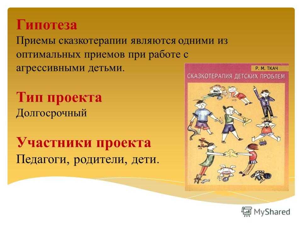 Гипотеза Приемы сказкотерапии являются одними из оптимальных приемов при работе с агрессивными детьми. Тип проекта Долгосрочный Участники проекта Педагоги, родители, дети.