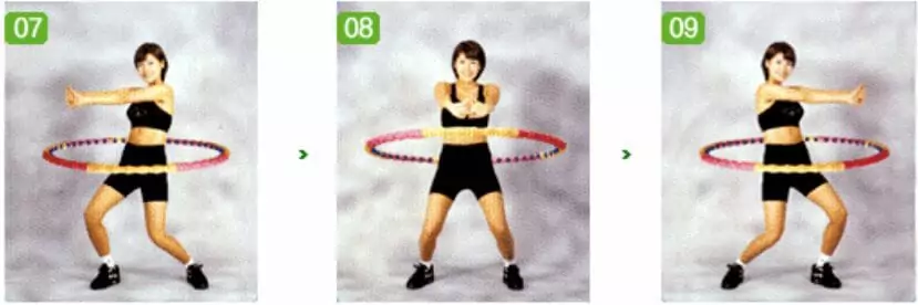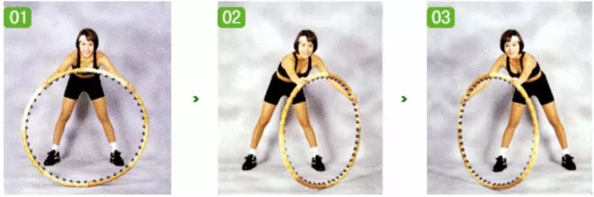 - Вращения со сменой ног. Выставив одну ногу вперёд, вращаем обруч. Через два вращения меняем ноги.