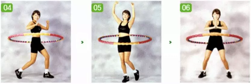 Крутя обруч слегка приподнимите руки. Делайте повороты вправо и влево бедрами, следуя его направлению вращения (4). Поднимите руки вверх и потянитесь (обруч вращается, 5). Напрягая талию и бедра, сведите руки на уровне груди (6). Выполните 3 подхода по 8 повторений в каждом упражнении.