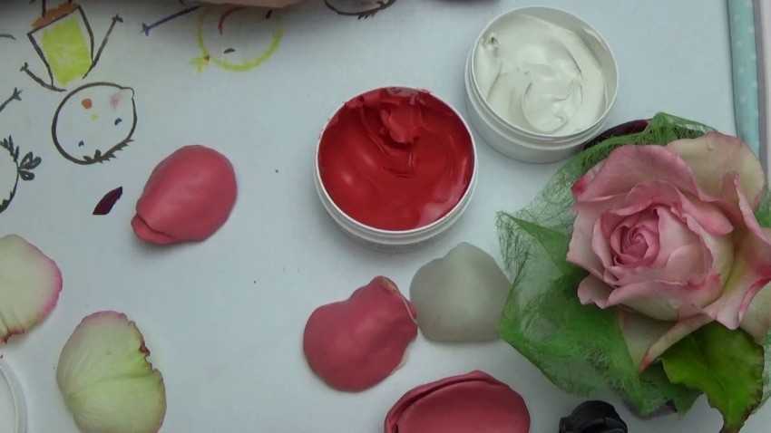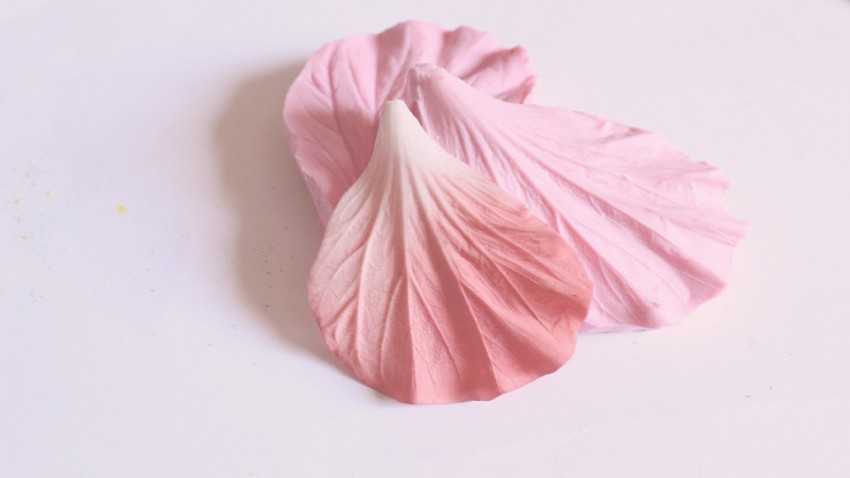 После этого отделяем небольшой элемент и раскатываем его скалкой. К поверхности силикона прикладываем трафареты из живых лепестков и листьев. Излишки смеси аккуратно отрезаем острым ножом. Готовые заготовки необходимо убрать в теплое место для полного высыхания. Для этого понадобится от 1 до 3 дней.