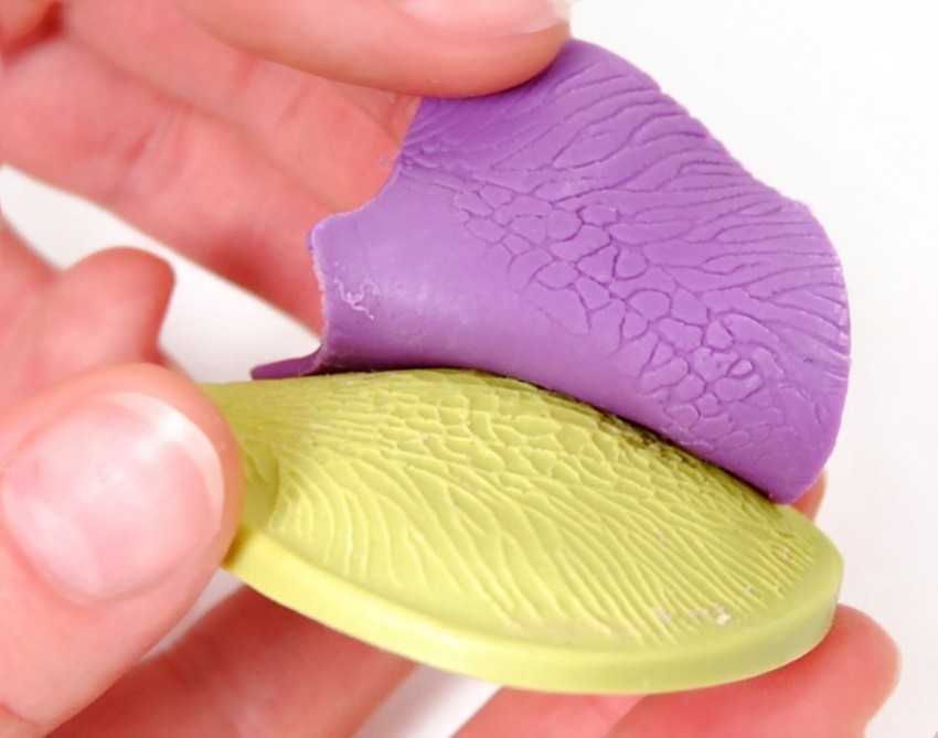 - Силиконовые формы тоже можно поделить на цельные и разборные (состоящие из 2−3 соединенных между собою деталей). Также есть иной вид молдов — вайнер. Эти формы созданы из более прочного силикона, который похож на резину. Они нужны для изготовления текстур. Чаще всего текстурные вайнеры сделаны из 2 деталей, между которыми зажимают листик мастики или фоамирана для придания ему необходимой текстуры.
